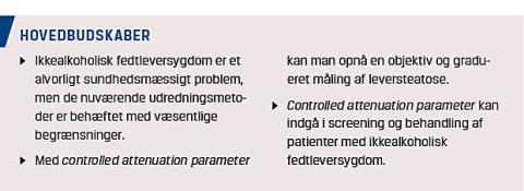 NAFLD er et stigende sundhedsproblem, især fordi sygdommen er tæt associeret med kardiovaskulær sygdom og død. Formentlig kan NAFLD betragtes som en metabolisk risikofaktor på linje med abdominalfedme, arteriel hypertension, dyslipidæmi og glukoseintolerans. UL-skanning er den anbefalede metode til diagnosticering af fedtlever, men den er semikvantitativ, operatørafhængig og ikke god, når man skal finde patienter med lavere grader af steatose. TE med CAP er en nem og hurtig undersøgelse, der med en høj grad af reproducerbarhed giver mulighed for at diagnosticere, risikostratificere og monitorere patienter med NAFLD, selv ved lavere grader af steatose. CAP og TE findes p.t. på gastromedicinske og infektionsmedicinske specialafdelinger, men kan på længere sigt blive udbredt til mere generel screening og behandlingsmonitorering hos denne store patientgruppe, hvis de nuværende høje priser for apparaturet falder. CAP har således potentiale til brug ved noninvasiv screening for og monitorering af leversteatose, på samme måde som TE hos de fleste patienter har erstattet biopsi til diagnostik af leverfibrose.