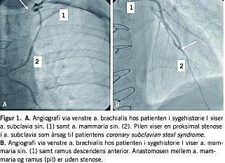 I. En 54-årig mand fik et akut myokardieinfarkt (AMI) i 1992, og ved en koronararteriografi (KAG) blev der påvist trekarssygdom. Der blev udført CABG med en vene til ramus-descendens posterior, vene til margo obt. gren og LIMA til ramus-descendens anterior. Det postoperative forløb var ukompliceret, og patienten var kardialt velbefindende indtil 2005, hvor der opstod angina pectoris. En KAG viste CSSS med retrograd flow i LIMA og en proksimal stenose i arteria subclavia sinistra (Figur 1 ). Der blev udført en reoperation uden brug af hjerte-lunge-maskine, hvor den proksimale LIMA blev løsnet og flyttet fra arteria subclavia til aorta ved hjælp af forlængelse med en venegraft fra underekstremiteten. Patienten var velbefindende og uden angina pectoris otte måneder postoperativt.