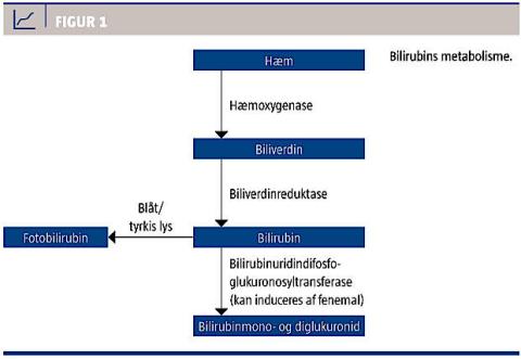 Bilirubin udskilles normalt ved, at det i leveren kobles til glukuronsyre i det endoplasmatiske retikulum katalyseret af bilirubinuridindifosfoglukuronosyltransferase (UGT1A1) (Figur 1). Herved dannes bilirubinmono- og diglukuronid, der er vandopløselige og kan udskilles med galden. UGT1A1 er lokaliseret på kromosom 2 q37 og har fem kodende exoner. Ved CN-1 er UGT1A1 helt inaktivt. Dette skyldes en mutation i et exon på begge alleler [4, 5].