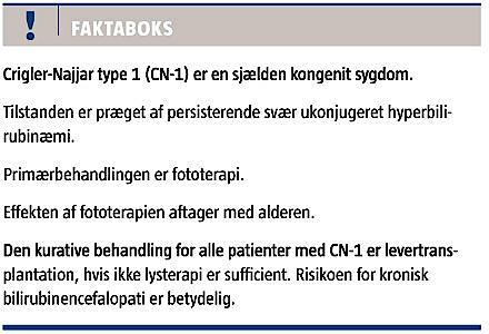 Crigler-Najjars sygdom type 1 (CN-1) er en sjælden kongenit sygdom med svær ukonjugeret hyperbilirubinæmi. Symptomerne opstår inden for de første levedage. Sygdommen blev beskrevet i 1952 af Crigler & Najjar [1]. I dette nummer af Ugeskrift for Læger beskrives denne sygdom for første gang i dansk litteratur [2]. Det er væsentligt, at sygdommen kendes af alle læger, der behandler børn, da den er en differentialdiagnose til andre, hyppigere tilfælde af svær hyperbilirubinæmi. Det er vigtigt hurtigt at erkende den meget høje plasmakoncentration af ukonjugeret bilirubin, så der kan iværksættes behandling for at undgå akut og kronisk bilirubinencefalopati (Kernikterus).