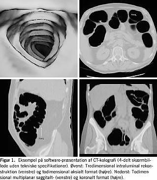 Proceduren består i tre trin: udrensning, skanning og billedanalyse. En optimal undersøgelse forudsætter optimal udrensning, der bedst opnås med dinatriumphosphat [2]. Hyoscinbutylbromid kan anvendes for at optimere udspiling og mindske bevægeartefakter, men der bruges hverken smertestillende eller beroligende medicin. Der skannes i både ryg- og bugleje, fordi ændringen i fordeling af luft og evt. restvæske synes at bidrage omkostningseffektivt til diagnostikken. Oftest er det primært de »almindelige« aksiale todimensionale billeder, der gennemses. Men analysen må fortages på en arbejdsstation, hvor der kan suppleres med todimensionale multiplanare reformaterede (saggitale og koronale) billeder og evt. kombineres med tredimensionale endoluminale rekonstruktioner i tilfælde af diagnostiske problemer (Figur 1 ). Hvis hele datasættet analyseres interaktivt i tredimensionalformatet, simuleres en sort-hvid koloskopi - en »virtuel koloskopi«. Denne analysemetode er imidlertid mindre omkostningseffektiv [3] og benyttes sjældent. Bl.a. derfor er betegnelserne CTK og MRK mere præcise.