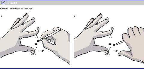 Ved fjernelse af små tumorer holdes curetten i pincetgreb i den dominante hånd, og den ikkedominante hånd stabiliserer læsionen (Figur 2A ). Ved større tumorer anvendes et håndgreb svarende til håndtering af en kartoffelskræller (Figur 2B).