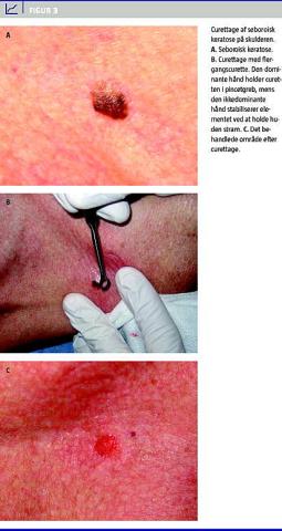 Ved behandling af benigne tumorer opnås under proceduren en fornemmelse af adskillelse af tumoren fra det underliggende væv (Figur 3 ). Man bør undgå for dyb curettage af hensyn til det kosmetiske resultat. En curette til flergangsbrug kan med fordel anvendes, idet engangscuretten er meget skarp og giver risiko for dyb curettage uden fornemmelse af elementets afgrænsning.