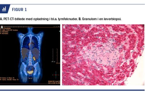En 49-årig kvinde blev indlagt. Hun havde 11 år tidligere fået diagnosticeret CVID efter seks tilfælde af pneumoni, Der blev fundet flg. værdier: immunglobulin (Ig)G 1,0 g/l (referenceinterval (RI): 6,1-15,7 g/l), IgA < 0,05 g/l (RI: 0,7-4,3 g/l) og IgM < 0,10 g/l (RI: 0,4-2,3 g/l). Diagnosen blev stillet på en infektionsmedicinsk afdeling ca. seks måneder efter symptomdebut, og hun blev behandlet med humant Ig. Hun blev senere henvist til en lungemedicinsk afdeling pga. et tilfældigt fund af forstørrede lymfeknuder i mediastinum og begge lungehili ved CT af thorax. PET-CT viste øget fluordeoxyglukoseopladning i lymfeknuder og mindre infiltrative forandringer i begge lunger (Figur 1A). Der blev foretaget bronkoskopi med bronkoalveolær lavage og endobronkial ultralydskanning med fund af ikkenekrotiserende granulomatøs inflammation, og tilstanden blev tolket som pulmonal sarkoidose. En lungefunktionsundersøgelse viste udåndingsvolumen i løbet af første sekund efter en forceret indånding på 1,72 l (73%), forceret vitalkapacitet på 2,24 l (81%) og diffusionskapacitet på 61%. Senere observerede man faldende ventilation og diffusion, selvom patienten blev behandlet med prednisolon. Man konkluderede, at der var tale om GLIDL.