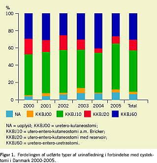 Gennemgangen viste 99%'s overensstemmelse mellem operationsregistreringen i LPR og epikriserne. Der blev i perioden 2000-2005 udført i alt 995 operationer, det vil sige ca. 160 operationer årligt. Af de 995 inkluderede patienter blev 969 cystektomeret pga. cancer, og 26 blev cystektomeret for nonneoplastiske tilstande såsom cystitis interstitialis, neurogen blære, incontinentia urinae og blæreempyem. Gennemsnitsalderen var 62 år, og 75% var mænd. Operationerne blev langt overvejende udført på syv afdelinger (Tabel 1 ). Den gennemsnitlige postoperative liggetid var 18,9 dage, uændret gennem årene. Hospitalsmortaliteten var 3,7% med en variation mellem 2,3% og 5,2% på de fem store centre (p > 0,05). De forskellige typer urinafledninger i forbindelse med cystektomien er vist i Figur 1 , hvor Bricker-blære-operationen var den hyppigste (ca. 50%) og cystektomi med neoblære næsthyppigst (ca. 30%) med stort set uforandret fordeling gennem perioden. Liggetiden var signifikant længere, når der blev anlagt tarmreservoir eller neoblære (henholdsvis 22 dage og 20 dage) i forhold til de andre urinafledningstyper eller uspecificeret urinafledning (18 dage). For de to hyppigste operationer KKBJ10 (Bricker-blære) og cystektomi med neoblære (KKBJ60) var hospitalsmortaliteten henholdsvis 4,7% og 2,3% (p > 0,05). Hospitalsmortaliteten for de øvrige urinafledningsmetoder var 3,6% for ureterokutaneostomi (KKBJ00), 2,4% for tarmreservoir (KKBJ20+40) og 4,3% ved ingen registrering af urinafledning (p > 0,05).