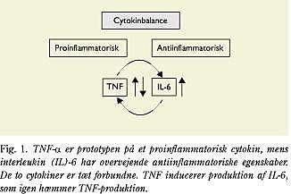I denne artikel fokuseres der overvejende på cytokinerne tumour necrosis factorα (TNF) og interleukin (IL)-6. TNF er det første cytokin, der produceres ved infektion eller vævsskade. TNF inducerer produktion af IL-1 og derefter IL-6, der igen hæmmer produktionen af TNF. TNF er et klassisk proinflammatorisk cytokin, mens IL-6 har stærke anti-inflammatoriske effekter. IL-6 hæmmer således TNF-produktionen og inducerer derudover produktion af andre antiinflammatoriske cytokiner, primært IL-1-receptor-antagonist (IL-1ra), der hæmmer funktionen af IL-1 samt induktionen af det akutte faseprotein C reaktivt protein. TNF og IL-6 er således tæt forbundne (Fig. 1).