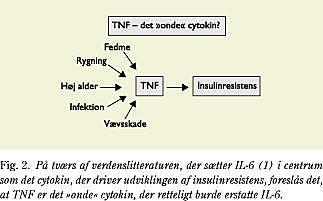 I tre uafhængige kohortestudier har vi vist, at såvel koncentrationerne af plasma-TNF som plasma-IL-6 stiger med alderen (2). Imidlertid er det kun TNF, og ikke IL-6, der er associeret med aterosklerose (2). Vi har endvidere vist, at både høje koncentrationer af TNF og IL-6 er associeret med mængden af abdominalt fedtvæv i univariatanalyse, mens kun TNF var associeret i multivariatanalyse. Sidstnævnte afspejler, hvorfor der kan være divergerende opfattelser af, hvilket cytokin der er mekanistisk associeret med insulinresistens, fedme og aterosklerose. De to cytokiner er som anført tæt forbundne (Fig. 1), og deres niveauer korrelerer derfor indbyrdes. Imidlertid viser basale studier, at TNF inducerer insulinresistens ved at nedregulere GLUT4-receptoren og hæmme insulinreceptorens funktion. I aktuelle studier, hvor vi har indgivet IL-6 til såvel unge som gamle, finder vi, at IL-6 ikke inducerer insulinresistens.