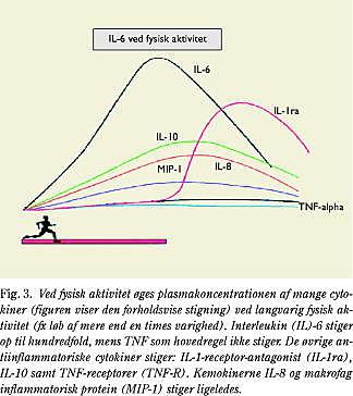Plasmakoncentrationen af IL-6 stiger i forbindelse med fysisk aktivitet (3-5). Stigningen kan være mere end hundredfold, afhængig af varighed og intensitet. IL-6-stigningen er markant også ved fysisk aktivitet uden nogen form for muskelskade. Plasmakoncentrationen af TNF stiger derimod som hovedregel ikke under muskelarbejde, mens samtlige kendte anti-inflammatoriske cytokiner stiger markant (Fig. 3).