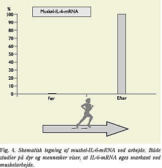 I muskelbiopsier fra såvel dyr som mennesker har vi fundet, at IL-6-mRNA er meget lavt i hvile, men stiger op til mere end 100 gange ved muskelarbejde (6, 7) (Fig. 4).