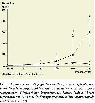 Ved at indlægge et kateter i vena femoralis har vi endvidere kunnet beregne, at IL-6 frigives fra et arbejdende ben, men ikke fra et hvilende ben hos samme person (8). IL-6-frigivelsen er betydelig og kan mere end fuldt ud forklare den systemiske stigning (Fig. 5).