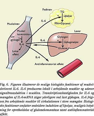 - IL-6 produceres lokalt i arbejdende muskler, frigives til cirkulationen i store mængder og cleares i leveren.