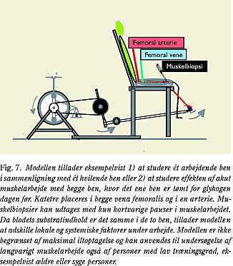Forsøgspersoner blev derfor sat til at tømme det ene ben for glykogen ved at udføre muskelarbejde med kun det ene ben dagen før selve eksperimentet, hvor de udførte muskelarbejde med begge ben (ét ben der var glykogendepleteret og ét kontrolben). De systemiske koncentrationer af bl.a. glukose og hormoner er i denne model således ens i begge ben, og modellen tillader at adskille lokale og systemiske faktorer (Fig. 7).