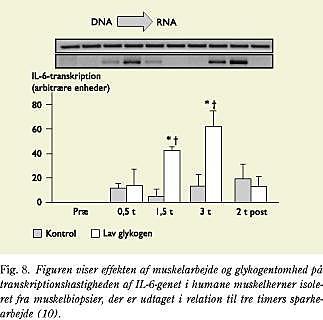 Forsøget viste, at IL-6-mRNA i muskelbiopsier var højest i det glykogendepleterede ben, og at også frisættelsen af IL-6 var betydelig hurtigere fra det ben med lavt glykogenniveau (9). Tilsvarende fund blev gjort i et efterfølgende forsøg, hvor vi studerede transkriptionshastigheden af IL-6-genet i muskelcellekerner isoleret i relation til muskelkontraktioner og glykogenniveau (Fig. 8).