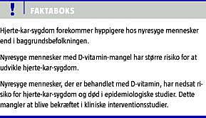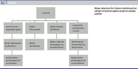 Lave niveauer af 25 hydroxyvitamin D og 1,25 dihydroxyvitamin D er vist at være associeret med udviklingen af hjerte-kar-sygdom og nedsat overlevelse hos nyresyge patienter. L av plasma-25 hydroxyvitamin D og -1,25 dihydroxyvitamin D er fundet associeret med øget mortalitet inden for de første tre måneder efter dialysestart og til forekomsten af kardiovaskulære hændelser hos peritonealdialysepatienter [11]. I et enkelt studie har lavt 25-hydroxyvitamin D-niveau vist sig at være prædiktor for tid til udvikling af terminalt nyresvigt og mortalitet hos nyhenviste nyresyge. Ligeledes er der hos normalbefolkningen i Framingham- og National Health and Nutrition Examination Survey -kohorterne påvist en sammenhæng mellem niveauet af 25 hydroxyvitamin D og kardiovaskulær sygdom og mortalitet [12, 13]. Det kan dog ikke udelukkes, at højt plasma-25 hydroxy-vitamin D blot er udtryk for en generel sundhedstilstand og derved er markør for andre faktorer, som hæmmer udviklingen af hjerte-kar-sygdom.