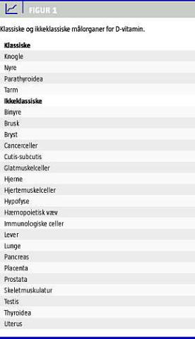 D-vitamins biologiske aktivitet medieres ved aktivering af D-vitaminreceptoren. D-vitaminreceptoren er en nukleær receptor, der ved binding af D-vitamin -heterodimeriserer med retinoidreceptoren. Dette kompleks bindes til en specifik promotorregion - D-vitaminresponselementet - som regulerer tran-skrip-tionen af dna. D-vitaminreceptoren forekommer ikke kun i de organer, der regulerer calciumhomeostasen (tarm, knogle, nyre), men også i en lang række af organismens øvrige organer (Figur 1 ). Herudover forekommer tillige en mindre velbeskrevet membranbunden receptor, hvilket dog ikke er påvist hos mennesker.
