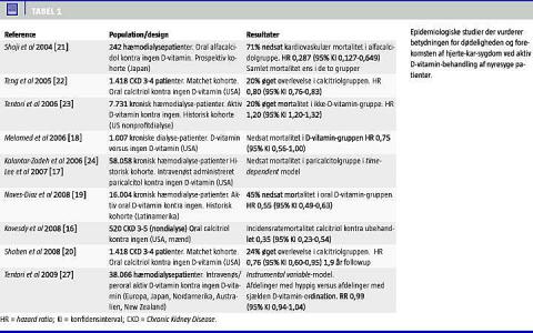 Det er opsigtsvækkende, at otte epidemiologiske studier af kronisk nyresyge populationer har vist nedsat kardiovaskulær og total mortalitet blandt D-vitaminanalogbehandlede nyresyge patienter i forhold til ikke-D-vitaminanalogbehandlede (Tabel 1 ) [16-24]. Desuden har man i tre opgørelser vist overlevelsesfordel ved behandling med de nyere D-vitaminanaloger frem for calcitriol [23, 25, 26].