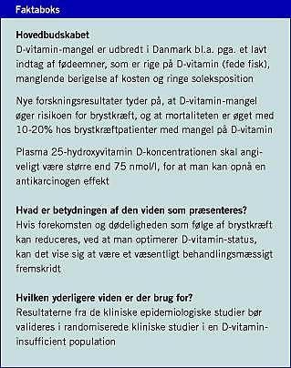 Gennem adskillige år har det været kendt, at aktivt D-vitamin påvirker kræftceller ved at virke antiproliferativt, fremme cellernes differentiering og forårsage apoptose. Imidlertid har aktivt D-vitamin ikke kunnet anvendes i behandling af kræft pga. hyperkalkæmiske bivirkninger. I laboratoriestudier har man nu påvist, at D-vitamin lokalt i tumorceller kan omdannes til aktivt D-vitamin, hvilket har ført til en øget interesse for, om den overordnede D-vitamin-status er af betydning for udviklingen og forløbet af brystkræft. I en række økologiske studier har man påvist, at geografisk bosted under hensyntagen til intensiteten af solbestrålingen påvirker brystkræftmortaliteten. Resultaterne af kliniske epidemiologiske studier har ligeledes bekræftet, at kostindtaget af D-vitamin tillige med intensiteten af solbestråling er af betydning for risikoen for at få brystkr æft. Imidlertid foreligger der kun få kliniske studier, og det er uvist, om menopausestatus og tumorcellernes østrogenreceptorstatus er af betydning for de mulige positive effekter af D-vitamin. P.t. er der ikke igangværende kliniske studier, hvor man har til hensigt at afklare de mulige positive effekter af D-vitamin [37]. Forhåbentligt vil sådanne studier snart blive iværksat. Da D-vitamin-mangel er særdeles hyppig i Danmark, og eftersom behandling med D-vitamin i det væsentligste er uden bivirkninger, kan det vise sig at være et stort fremskridt i cancerbehandlingen, hvis resultaterne fra de epidemiologiske og kliniske studier kan reproduceres i et randomiseret design. De randomiserede undersøgelser bør udføres i populationer, hvor der er en høj forekomst af D-vitamin-insufficiens, da D-vitamin-intervention må antages at være af mindre betydning i sufficiente befolkninger.