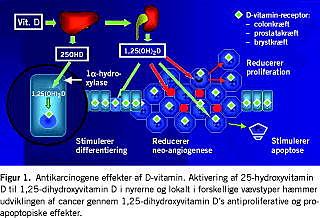 Det er velkendt at 1,25(OH)2D er af væsentlig betydning for calciumhomøostasen og knogleomsætningen, idet 1,25(OH)2D øger absorptionen af bl.a. calcium i tarmen og påvirker knoglevævets mineralisering. Desuden udøver 1,25(OH)2D virkninger i mange andre væv. Der er således påvist VDR i stort set alle vævstyper, som er blevet undersøgt for deres indhold af VDR, hvilket tyder på, at 1,25(OH)2D udøver generelle biologiske effekter [8]. 1,25(OH)D har funktioner som et steroidhormon (Figur 1). Når 1,25(OH)D bindes til nukleære VDR, påvirkes den intracellulære proteinsyntese, herunder faktorer af betydning for reguleringen af cellecyklus [9]. 1,25(OH)2D kan således hæmme cellers proliferation samtidig med, at differentieringen øges [10]. Tillige påvirker 1,25(OH)2D dannelsen af forskellige vækstfaktorer, hvorved 1,25(OH)2D kan forårsage apoptose. I in vitro-studier har man således påvist, at 1,25(OH)2D bl.a. hæmmer dannelsen af insulin-like growth factor I (IGF-I) i forskellige brystcancercellelinjer. I tumorceller hæmmer IGF-I den normale vækstregulering og mindsker tendensen til apo-ptose [11, 12]. Tilsætning af 1,25(OH)2D til sådanne cellelinjer modvirker de antiapoptotiske og proliferative effekter af IGF-I [13]. Tillige har man i flere studier påvist, at effekten af 1,25(OH)2D er mest udtalt i østrogenreceptorpositive (ER+) cancerceller, hvor 1,25(OH)2D øger cellernes differentiering og nedregulerer ekspressionen af østrogenreceptoren [14, 15].