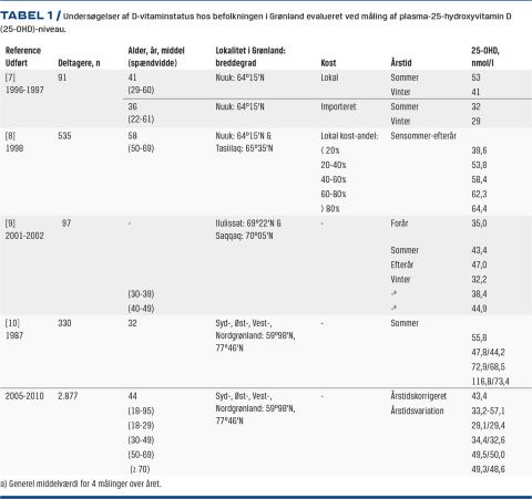 Sæsonforskelle er også rapporteret i justerede middelværdier af plasma-25-OHD-niveau målt over året hos 2.482 af de 2.877 personer, der var inkluderet i det seneste studie [10]. Studiet var baseres på enkeltmålinger justerer for alder, køn og kost og beskrev en sæsonvariation på 42% med stigning fra 33 nmol/l til de højeste værdier i efteråret på 57 nmol/l (Tabel 1). Det er interessant, at forfatterne fandt en begrænset effekt af geografi i dette studie, der strækker sig over 17047’ breddegrader, hvilket svarer til 1.978 km fra den sydligste til den nordligste beboelse for de personer, der var inkluderet. Det kunne tolkes således, at den lavere soleksposition i vinterperioden i Nordgrønland kompenseres i sommerperioden, hvorved den samlede soleksposition over året udjævnes, og relationen til breddegrad reduceres i det arktiske område.