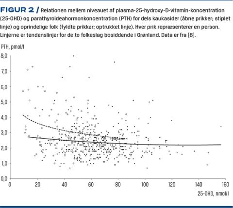 Kalkomsætning er under stram kontrol af kraftige hormonelle mekanismer, hvorfor det er interessant, at man i tre undersøgelser af plasma-25-OHD-niveauet hos folk i Grønland samstemmende fandt en effekt af etnicitet [7-9]. Dette kan tolkes som en tilpasning til det arktiske miljø og den kalkfattig arktiske kost. Rejnmark et al fandt tillige indflydelse af etnicitet på niveauet af parathyroideahormon (PTH) og 1,25-dihydroxy-D-vitamin [7], og senest er det dokumenteret, at et lavt plasma-25-OHD-niveau er associeret med stigning i PTH hos kaukasider i Grønland, men ikke hos personer af grønlandsk afstamning (Figur 2) [22]. Ligeledes adskiller de to grupper sig ved, at der er en forskel imellem folkeslag i associationen mellem fedme og plasma-25-OHD-niveau [4].