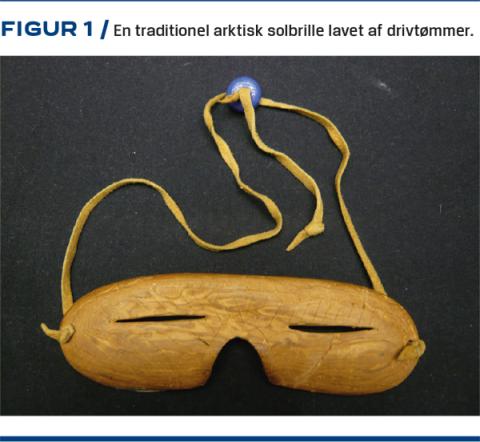 Når huden udsættes for kortbølget UV (UVB)-lys (290-315 nm) dannes der D3-vitamin ud fra 7-dehydrocholesterol, hvorfor UVB-lys er en væsentlig faktor i kroppens egenproduktion af 25-OHD. En række faktorer påvirker eksponeringen for UVB-lys hos folk i det arktiske område. Den manglende direkte sol nord for polarcirklen i den arktiske nat og solens lave højde på himlen, når den er stået op, reducerer indfaldet af lys. Således har sammenligning af resultater fra forskellige studier vist, at plasma-25-OHD-niveauet aftager med højere breddegrader hos kaukasider [11]. Imidlertid spiller også hudens pigmentering, temperatur og dermed påklædning en rolle for effekten af UVB-eksponering [3-5]. Udtynding af ozonlaget er mest udtalt over polerne, hvilket bidrager til en øget intensitet af UVB-lys [12]. Dertil tilbringer fangere i Grønland i foråret og sommeren periodevis hele døgnet udendørs [9], hvor lyset intensiveres af refleksion fra sne, is og hav. Det øger risikoen for at blive sneblind, og traditionelle solbriller var almindelige i Arktis (Figur 1). Nettoresultatet af disse faktorer har vakt nysgerrighed og er inkluderet i flere undersøgelser i Grønland.