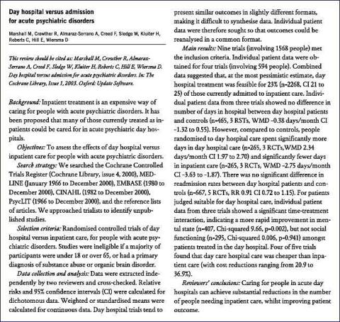 <li>Marshall M, Crowther R, Almarez-Serrano A et al. Day hospital versus admission for acute psychiatric disorders (Cochrane Review) I: The Cochrane Library, Issue 1, 2003. Oxford: Update Software.</li>