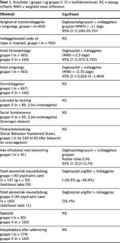 Ved daghospitalsbehandling blev der opnået reduktion i forbrug af sengedage ved indeksindlæggelsen og efterfølgende, men der måtte ydes flere fremmødedage. Der blev opnået en højere patienttilfredshed. Resurseforbruget afhænger af organisationsformen. For gruppe I-materialets vedkommende var der i fire ud af fem undersøgelser en reduktion i daghospitalsbehandling på mellem 20,9% og 36,9% af de samlede omkostninger til den psykiatriske behandling, mens der var en øget udgift på 26,4% i materialet, der omfattede gruppe II-undersøgelserne. Meget forenklet tyder metaanalysen på, at ca. 25% af de patienter, som indlægges, meget hurtigt kan overgå til dagbehandling, når der ikke skæres ned på resurserne hertil.