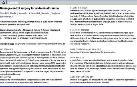 I Cochranereviewet »Damage control surgery in abdominal trauma« var intentionen at undersøge, om damage control surgery (DCS) var mere effektiv end traditionel definitiv kirurgi til at mindske 30-dages-mortaliteten og -morbiditeten. Det konkluderes, at fordelene ved DCS endnu ikke kunne dokumenteres, da der ikke fandtes randomiserede kontrollerede undersøgelser.
