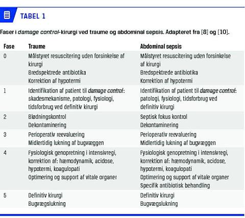 Den stadieinddelte tilgang i DCS ved det septiske abdomen er formuleret af Weber et al [8] som en omskrivning af Moores fem faser (Tabel 1). Efter passende intensiv målstyret resuscitering og administration af bredspektret antibiotisk behandling skal patienten snarest muligt opereres. Her er det primære mål ved DCS at kontrollere udgangspunktet for den septiske tilstand og afvente definitiv kirurgi til et tidspunkt, hvor fysiologien er stabiliseret. Det vil sige, perforationer lukkes, eller det perforationsbærende område fjernes, men tarmkontinuiteten reetableres ikke primært [7-9]. En anastomose i et inficeret felt eller hos en fysiologisk derangeret patient vil, alt andet lige, have et dårligere helingspotentiale [18, 19]. Da tidsforbruget inden intensiv terapi er afgørende for patientens outcome, skal operationstiden holdes på et minimum [7-9]: I traumatologien anbefales det at holde operationstiden under 90 minutter [3]. Derfor etableres der ofte ikke stomi, men tarmenderne efterlades blindlukkede, til patienten er stabiliseret [7-9]. Herved undgår man også de ikke ubetydelige komplikationer, der kan forekomme ved en senere tilbagelægning. I et dansk studie af 189 patienter var den postoperative mortalitet efter stomitilbagelægning på 3,2%, den overordnede komplikationsfrekvens var 49,6%, mens 8% fik anastomoselækage, og 17,5% endte med en ny stomi [20]. Bugvæggen kan med fordel lukkes midlertidigt med et vacuum-assisted closure (VAC)-system, der både sikrer drænage og hurtig adgang til abdomen ved relaparotomi [21]. Endvi-dere tyder studieresultater på en bedre overlevelse med VAC end med primær lukning ved abdominal sepsis [22]. Der ses i dag, efter indførelsen af åbent abdomen med VAC og en mere restriktiv væsketilførsel, en lavere forekomst af abdominalt kompartment-syndrom. Dette var tidligere en hyppig og alvorlig komplikation efter akut laparotomi ved abdominal sepsis [21, 23].