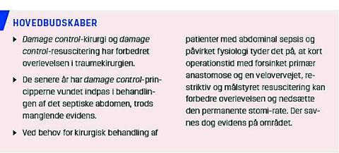 Det septiske abdomen defineres som tilstedeværelsen af systemisk inflammatorisk stress respons-syndrom og en abdominal infektion, der kræver kirurgisk intervention [14]. De underliggende årsager kan være perforeret ulcus, divertikulitis, appendicitis eller perforation i forbindelse med ileus, volvulus, inkarcereret hernie, mesenteriel iskæmi eller anastomoselækage efter et kirurgisk indgreb [15]. Den mortalitetsrate, der er rapporteret i litteraturen, varierer fra 10% til 36% og er afhængig af definitionen, den tilgrundliggende årsag, patientens komorbiditet og ikke mindst udviklingen af septisk shock, hvor mortalitetsrater op til 70% er angivet [14-17]. Ved hurtig diagnostik samt antimikrobiel og kirurgisk behandling er definitiv kirurgi oftest at foretrække ved det septiske abdomen. Ved tarmperforation og peritonitis hos en patient med derangeret fysiologi og flere komorbiditeter kan damage control-principperne både mht. kirurgi og resuscitering dog tænkes at forbedre patientens overlevelse i den akutte fase [7-9].