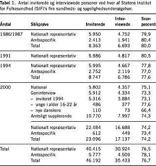 I alle undersøgelser indgår der en nationalt repræsentativ stikprøve. I 2000 var den nationalt repræsentative stikprøve sammensat med henblik på at sikre amtslig repræsentativitet ved mindst 1.000 gennemførte interview i hvert amt [3]. Stikprøven er derfor sammensat af tre delstikprøver: 1) en national stikprøve fra hele landet, 2) en stikprøve af geninterviewede og 3) en amtsligt supplerende stikprøve, der sikrede mindst 1.000 interviewede personer i hvert af landets amter. I geninterviewstikprøven indgik alle levende fra den nationale stikprøve i 1994 og en stikprøve af unge (alder 16-22 år i 2000) og personer, der havde fået dansk statsborgerskab i perioden 1994-2000.
