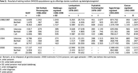 Alle 40.769 personer i DANCOS er ved brug af de inviteredes CPR-nummer blevet fulgt i det Centrale Personregister (til 2002), Dødsårsagsregisteret (til 1998), Landspatientregisteret (1978-2001), Det Psykiatriske Centralregister (1969-1997, opdatering for SUSY-2000 er endnu ikke foretaget), Sygesikringsregisteret (1990-2001) og Cancerregisteret (1943-1999). Flere af disse registre er omtalt i nærværende nummer af Ugeskrift for Læger. I Tabel 2 findes der en oversigt over resultatet af registerkoblingen for hvert register og hver SUSY-undersøgelse. For de sygdomsspecifikke registre er hændelser både før og efter invitationen medtaget i tabellen.