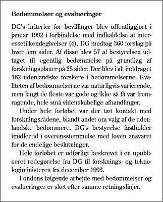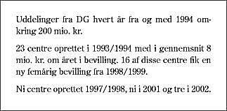 Hvad skal der blive af de centre, som er blevet blandt de bedste i verden på deres område? DG's bestyrelse har i 1999 besluttet, at ingen centre kan få bevillinger i mere end to femårige perioder. Denne beslutning kan være begrundet i det almindelige danske ønske om, at ingen skal være privilegerede. »Nu må det være andres tur!« Beslutningen kan også være begrundet i, at institutionerne skal overtage det økonomiske ansvar for det, som er sat godt i gang (indlejring). Dette er urealistisk.