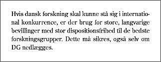 Hvis vi skal konkurrere i den internationale forskningsverden, specielt med forskningen i USA, er det nødvendigt at give vores bedste forskningsgrupper store langsigtede bevillinger med dispositionsfrihed. Der skal være mulighed for fortsat bevilling, så længe forskningsgrupperne er konkurrencedygtige.