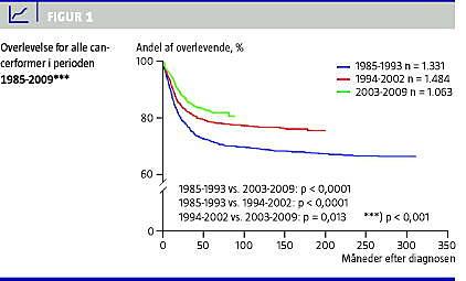 Den årlige incidens varierer mellem 12,5 og 20 tilfælde pr. 100.000 børn under 15 år, uændret siden 1985. Den recidivfri femårsoverlevelse for alle cancerformer er 73,7%, og femårsoverlevelsen er steget signifikant siden 1985 og er nu 82% (Figur 1 ). Andelen af de behandlingsrelaterede dødsfald er 3% af samtlige nydiagnosticerede patienter. I forløbet fra diagnosedato til behandlingsstart er medianen under syv dage og hos 80% mindre end 14 dage. Der er registreret 51 sekundære cancertilfælde i populationen på 4.188 børn under 15 år, der blev diagnosticeret i perioden 1985-2011. Epidemiologiske data registreres årligt til fælles nordiske databaser for både leukæmi, lymfom og solide svulster. Registreringen har vist, at rapportering til internationale protokoller kun foregår i tilfredsstillende omfang for de akutte leukæmier.