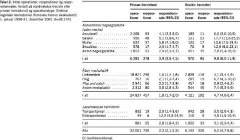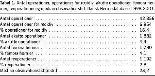 I alt 6.954 operationer blev udført for recidivhernie (16,4% af alle operationer), og 1.192 reoperationer blev udført på patienter, som fik deres første operation efter den 1. januar 1998 (Tabel 1 ). 4,1% af alle operationer var for et femoralhernie, og 4,4% blev udført som akut operation. 30-dages postoperativ mortalitet var højest (7%) ved akut kirurgi og kun 0,2% ved elektiv operation. Reoperationsrater for recidivbrokoperation var ca. dobbelt så høj som operation for primært hernie (Tabel 2 ).