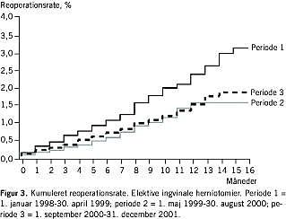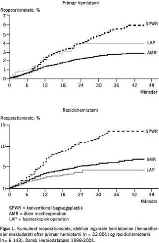 Kaplan-Meier-plot af reoperationsraten efter 48 måneder ved operation for primært ingvinalhernie er anført i Figur 1 A> og var signifikant lavere efter åben meshoperation og laparoskopisk operation (2,9% og 4,0%) end efter sutureret bagvægsplastik (6,1%, p < 0,001). Reoperationsraten efter operation for recidivhernie var lavere efter laparoskopisk operation (4,4%) end efter åben meshoperation (7,1%, p < 0,01) og begge disse reoperationsrater var lavere end for sutureret bagvægsplastik for recidivhernie (14%, p < 0,001) (Figur 1). I observationsperioden steg anvendelsen af Lichtensteins meshoperation fra 33% til 69% med samtidig fald i anvendelse af andre operationsteknikker bortset fra laparoskopisk udført operation, som konstant var ca. 5%. 50% af de laparoskopiske operationer blev udført på tre afdelinger, mens de resterende 50% blev udført på 38 afdelinger. Kummuleret reoperationsrate efter operation for femoralhernie var 8%, uden påviselige forskelle mellem de forskellige operationstyper.