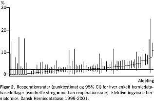 Operation for lyskebrok er en principielt enkel operation, som rutinemæssigt burde kunne udføres i ambulant regi med lav reoperationsrate, morbiditet og rekonvalescens. Disse resultater synes opnåelige i private herniecentre, hvor operationen udføres i lokal anæstesi på ambulant basis og med meget lave reoperationsrater og kort rekonvalescens [5, 6]. Imidlertid er sådanne opgørelser behæftet med patientselektionsbias og inkomplet followup, som vanskeliggør fortolkning. Data fra landsdækkende registreringer findes ikke bortset fra den Danske Herniedatabase [7], men erfaringer fra den store regionale database i Sverige foreligger [8].
