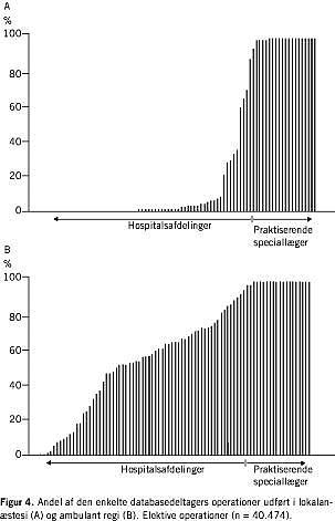 Operation i lokalanæstesi blev udført ved 17,8% af de elektive operationer, og denne andel var nogenlunde konstant i perioden. Lokalanæstesi blev overvejende anvendt hos praktiserende speciallæger, og rutinemæssigt kun anvendt på få hospitalsafdelinger (Figur 4 ). Reoperationsraten var lavest efter lokal anæstesi (generel anæstesi 2,9%, regionalanæstesi 3,2% og lokalanæstesi 2,4%, p < 0,05 lokalanæstesi vs. generel anæstesi og lokalanæstesi vs. regional anæstesi).