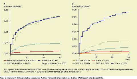 Resultater: Dødeligheden i de første 30 dage efter PCI var 3,2% og afhang af indikationen for PCI: ST-elevations-myokardieinfarkt (STEMI) 6,8%; non-STEMI og ustabil angina pectoris 1,9% og stabil angina pectoris 0,5%. Der var ikke signifkant forskel på overlevelsen mellem centrene efter primær PCI på indikationen STEMI, p = 0,30. Dødeligheden i de første 30 dage efter isoleret CABG var 2,6% og var klart relateret til patientens European System for Cardiac Operative Risk Evaluation (EuroSCORE). Der var ikke signifikant forskel på overlevelsen mellem centrene efter isoleret CABG, p = 0,12.