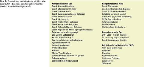 Landsdækkende kliniske databaser (LKD) er offentlige registre vedrørende en sygdomsgruppe, en bestemt diagnose eller en behandlings- eller undersøgelsesmetode. LKD er primært et redskab til kvalitetsudvikling på kliniske afdelinger, og det kan vurderes, om behandlingsresultaterne på den enkelte afdeling er på højde med det ønskelige, ligesom et kvalitets-niveau kan søges forbedret ved at skele til afdelinger med gode resultater. LKD finansieres af Amtsrådsforeningen (ARF), idet det i 2002 blev besluttet at gå fra den såkaldte »værtsamtsmodel« til en model, der var baseret på solidarisk finansiering. Samtidig blev området tilført epidemiologisk, statistisk og it-mæssig ekspertise gennem oprettelsen af tre kompetencecentre, ligesom den økonomiske støtte til data-baserne blev betinget af, at de kunne leve op til en række sundhedsfaglige, organisatoriske og it-mæssige krav. I Figur 1 ses en samlet oversigt over de LKD'er, der er tildelt støtte i 2005. For nærmere beskrivelse af LKD og deres organisation henvises til dokumenterne »Programbeskrivelse« samt »Basiskrav og retningslinier for kliniske kvalitetsdatabaser«, som findes på www.kliniskedatabaser.dk og på www.arf.dk