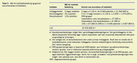 Cirka 8% genindlægges efter hysterektomi med en median indlæggelsestid på tre dage. Genindlæggelsesfrekvensen forventes nedbragt til 4%. Ved brug af hoteltaksten vil der være en potentiel reduktion fra 510 kr. pr. patient til 255 kr. pr. patient. Disse omkostninger er beregnet uden medtagelse af operationsomkostninger i forbindelse med genindlæggelsen, og den potentielle besparelse er derfor større, men er på baggrund af det nuværende datagrundlag ikke mulig at beregne.