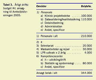 Udviklingsomkostningerne for databasen udgør 372.000 kr. i henhold til bevilling fra Sundhedsministeriet i 2003. Den årlige drift af DHD i et LPR-baseret databasekoncept udgør, i henhold til ansøgning til ARF-databasepulje 2005, de beløb, som fremgår af Tabel 3 . Dertil kommer en årsløn på 365.000 kr. til den tilknyttede ph.d.-studerende, som blandt andet sikrer den daglige drift af databasen.