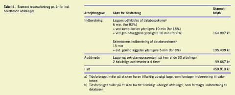 Personalets estimerede resurseforbrug til registrering fremgår af Tabel 4 . Hertil kommer et varierende tidsforbrug, som afdelingsrepræsentanten har anvendt på at introducere lægerne på de enkelte afdelinger til databasekonceptet, ligesom en sekretær på hver afdeling har brugt ca. halvanden time til prøveindberetninger.