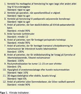 På baggrund af registerets data blev organisation af diagnostik og behandling, langtidsoverlevelse og sammenhæng mellem afdelingsvolumen og resultater for perioden 1994-1999 beskrevet [1-3]. I 2001 blev patienter med coloncancer inkluderet i registeret, som samtidig gennemgik en omfattende revision. Således blev en række livsstilsfaktorer medtaget, ligesom DCCG's forretningsudvalg definerede 12 kvalitetsindikatorer med tilhørende standarder på baggrund af de evidensbaserede nationale retningslinjer for diagnostik og behandling af sygdommen (Figur 1 ). Hermed blev der skabt en værdifuld relation mellem kliniske retningslinjer og overvågning af deres efterlevelse i en klinisk kvalitetsdatabase. Samtidig blev databasen knyttet til Kompetencecenter Øst, og siden 2001 har sygehusejernes fælles databasepulje, Amtsrådsforeningen og H:S finansieret registerets drift.