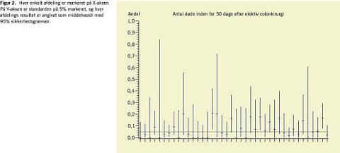 I årsrapporterne fra databasen offentliggøres både overordnede data vedrørende kolorektal cancer og afdelingsspecifikke resultater for de 12 indikatorer [5]. Et eksempel på et overordnet resultat er antallet af kirurgiske afdelinger, hvor man behandler kolorektal cancer, og hver enkelt afdelings patientantal. Et andet eksempel er påvisningen af, at mindst 19% af patienterne i 2003 debuterede med fjernmetastaserende sygdom, og derfor var uden for rækkevidden af kurativ behandling. Hensigten med offentliggørelse af afdelingsspecifikke resultater for hver indikator er, at en afdeling skal kende sit resultat i forhold til indikatorens standard og landsgennemsnittet for om nødvendigt at kunne forbedre sit resultat. Dermed henvender årsrapporterne sig primært til de sundhedsfaglige miljøer, som har vist resultaterne stor interesse. Det er imidlertid også et krav fra sygehusejerne, at afdelingsidentificerbare data offentliggøres med henblik på, at kommende patienter får bedre mulighed for at vælge behandlingssted. I Figur 2 ses et eksempel på afdelingsspecifikke resultater for den standard, der fastsætter, at 30-dages-mortaliteten efter elektiv, kurativ operation for coloncancer højst må være på 5%. Som det fremgår, havde man på nogle afdelinger en signifikant højere mortalitet, men samtidig viser figuren de tolkningsvanskeligheder, mange nationale kvalitetsregistre har på afdelingsniveau: De store sikkerhedsgrænser for middelværdien som følge af, at et begrænset antal patienter behandles på et relativt stort antal afdelinger.