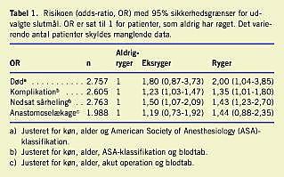 En anden konsekvens af det beskedne antal patienter pr. afdeling er, at mere avancerede analyser sjældent er mulige. Der kan således kun undtagelsesvist justeres for afdelingernes patientsammensætning med hensyn til komorbiditet, livsstilsfaktorer osv. - faktorer, som er af stor betydning for behandlingsresultatet. Af Tabel 1 fremgår således effekten af tobaksrygning på udvalgte slutmål, beregnet ud fra reg isterets oplysninger. Således er f.eks. risikoen for død inden for 30 dage efter operation fordoblet for rygere, og risikoen for komplikationer under et er øget med 35%. For eksrygere ses næsten tilsvarende øgede risici [6].