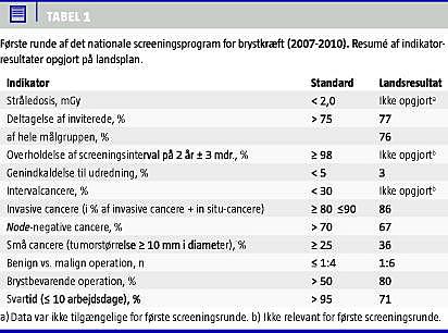 Resultaterne fra den første nationale screeningsrunde viste en deltagelsesprocent på 77. 3% blev genindkaldt til klinisk mammografi. Fem ud af seks opererede kvinder havde cancer, og 80% med invasive cancere fik brystbevarende operation. Andelen af in situ-cancere var 14%. 36% af de invasive cancere var = 10 mm, og 67% var lymfeknudenegative. 71% fik svar på undersøgelsen inden for ti hverdage (Tabel1).
