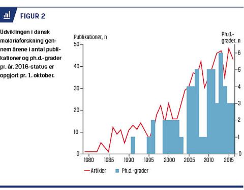 I den patientorienterede forskning indgår danske malariapatienter, men fokus er i langt højere grad på både raske og syge mennesker i lande, hvor smitte med malariaparasitter forekommer, særligt i Afrika. Danske malariaforskere er stærkt engagerede i forskningssamarbejder med kolleger i en lang række lande på alle kontinenter. Dansk malariaforskning har resulteret i over 700 videnskabelige publikationer siden 1980 (Figur 2). Udviklingen har været positiv, både i kvantitet og kvalitet, og forskningen publiceres regelmæssigt i førende tidsskrifter. Der er gennem årene desuden tildelt ca. 60 ph.d.-grader fra Københavns Universitet som direkte resultat af denne forskning. Også her har antallet været stigende gennem årene (Figur 2). Hertil skal lægges et antal m.phil.- og ph.d.-grader, der fra udenlandske – især afrikanske – universiteter er tildelt på grund af forskning udført i samarbejde med danske malariaforskere.