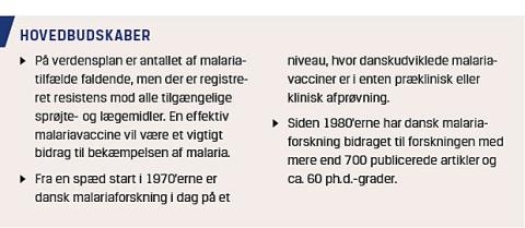 I Danmark er der 80-100 importerede malariatilfælde om året [9]. Til trods for de relativt få tilfælde, der importeres, har Danmark en lang tradition for at forske og deltage i bekæmpelsen af malaria. Vi beskriver her den danske indsats mod malaria gennem de seneste årtier og belyser nuværende forskningsområder.